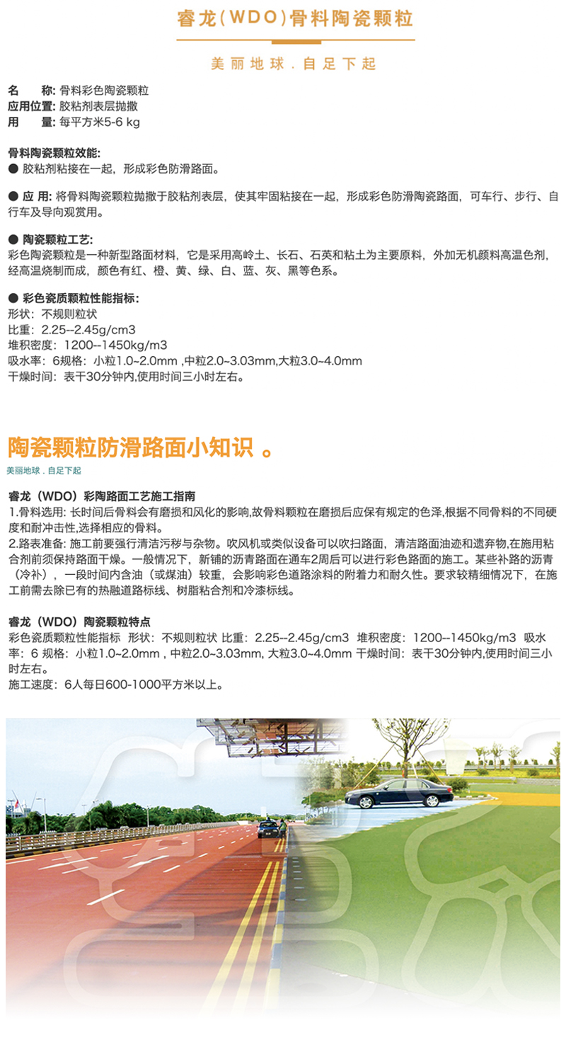 彩色陶瓷颗粒是一种新型路面材料,它是采用高岭土、长石、石英和粘土为主要原料,外加无机高温色剂,经高温烧制而成,颜色有红、黄、绿、白、蓝、灰等色系。