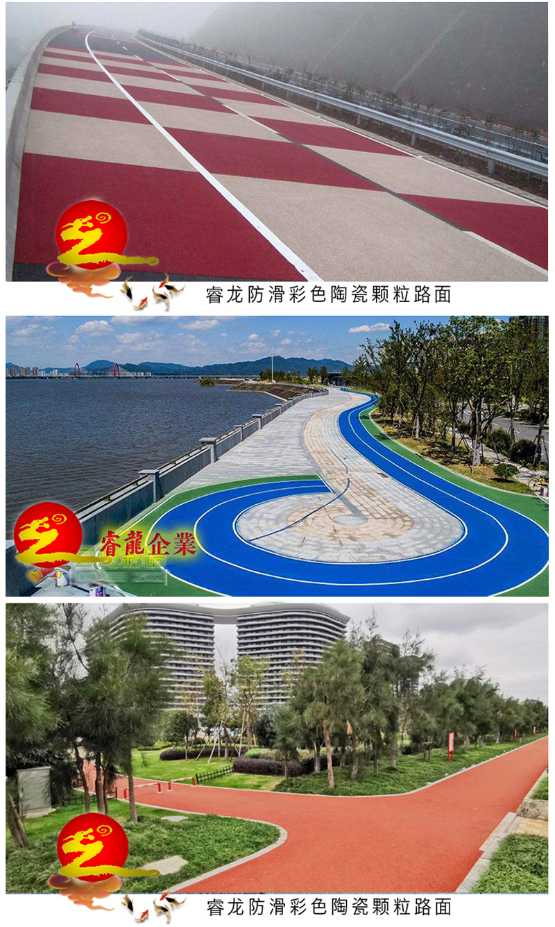 彩色陶瓷颗粒是近几年来普遍采用的一种新型路面材料。其具有防滑耐磨、环保耐腐、吸水率低、色泽鲜艳、美观、坚硬牢固、使用寿命长等特点。