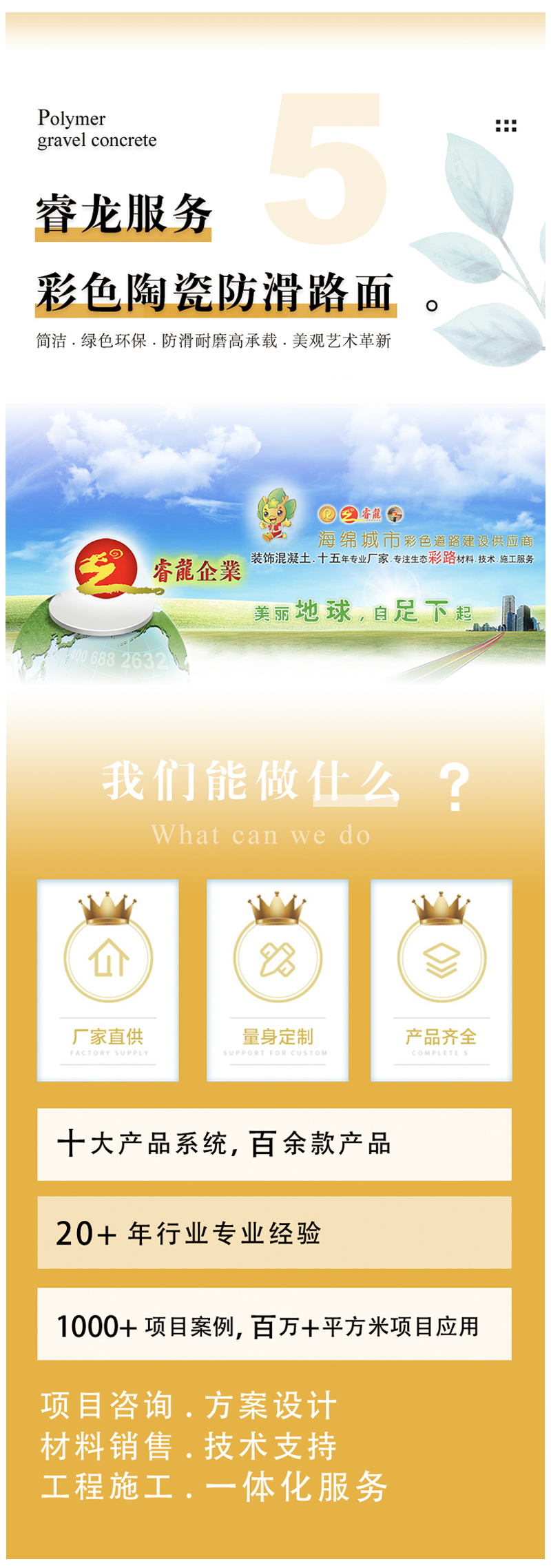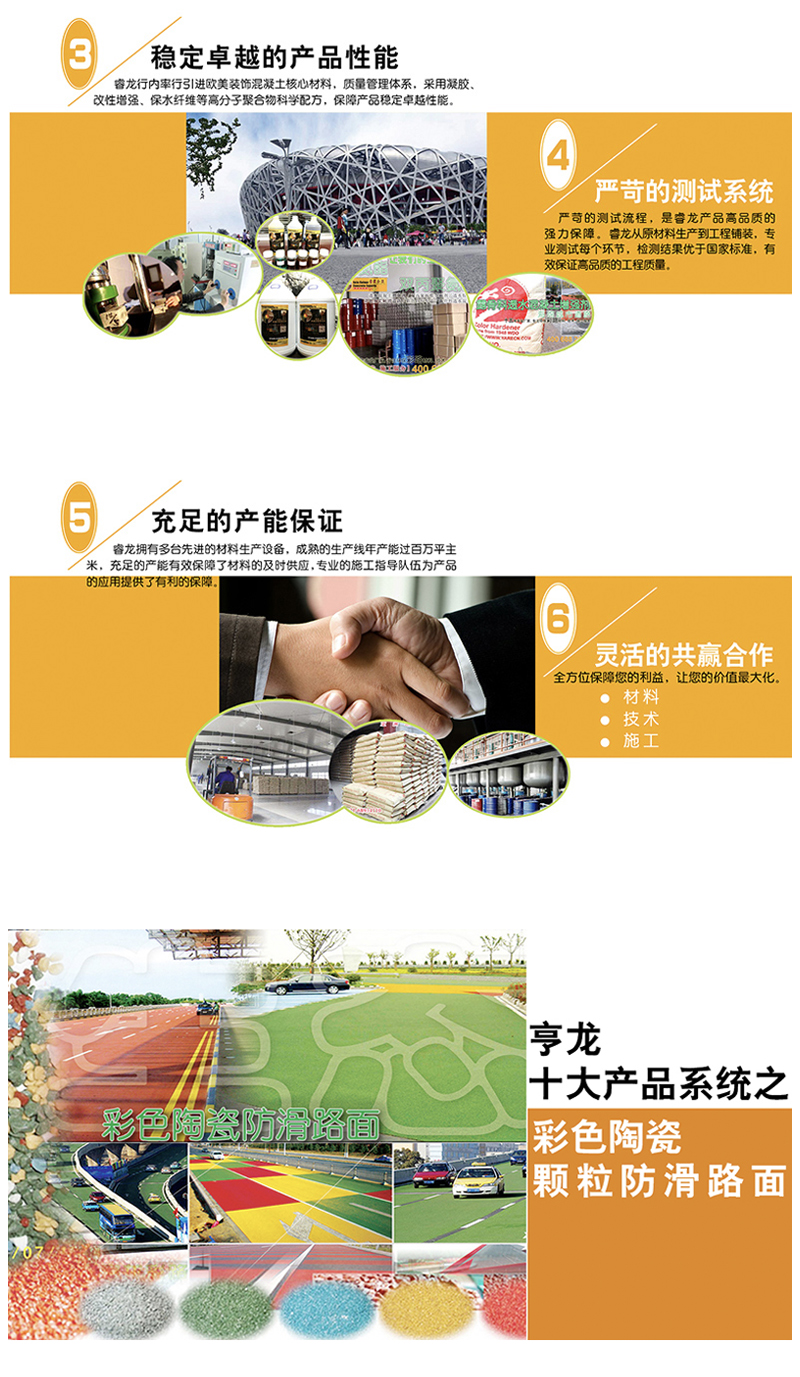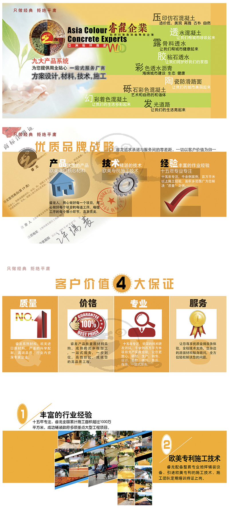 十五年专业环保生态路面厂商,九大产品系统, 百余款产品材料、技术、施工概念服务。完善的售前售后服务及施工指导体系,同时可代为客户进行各类彩色混凝土装饰面层的设计和施工的技术指导。