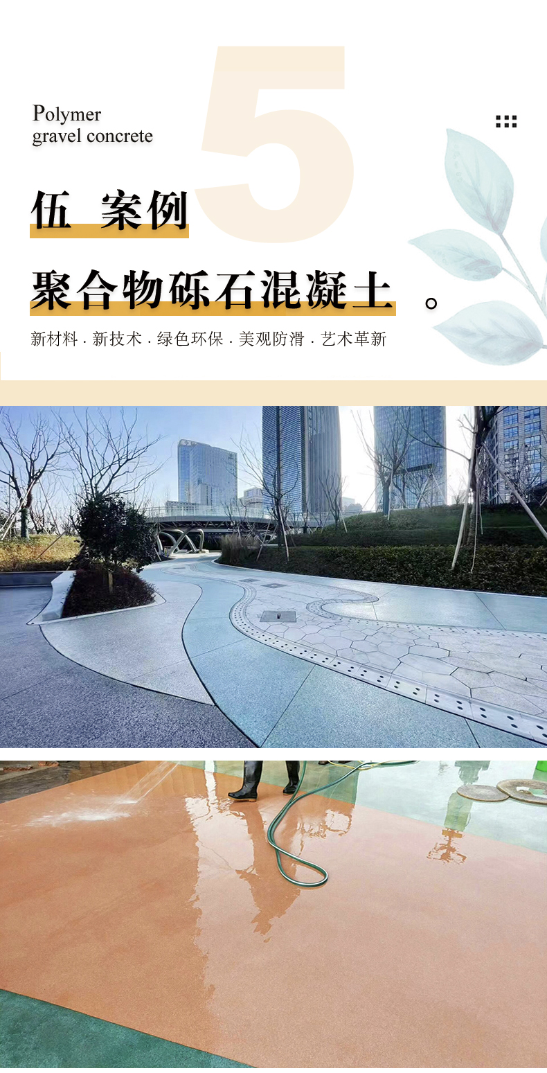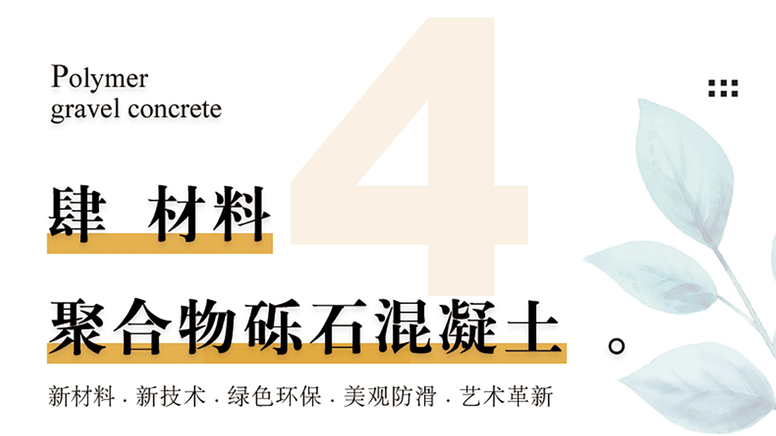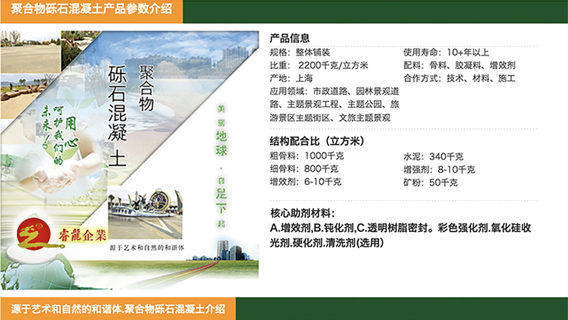 聚合物砾石混凝土由四种核心助剂材料,形成目前国际上高科技环保铺装系统-聚合物改性高强装饰性混凝土。集”色彩、质感、防滑、细腻和高承载”等多种功能与和效果于一体,高强抗裂、自然美观、经久耐用。
