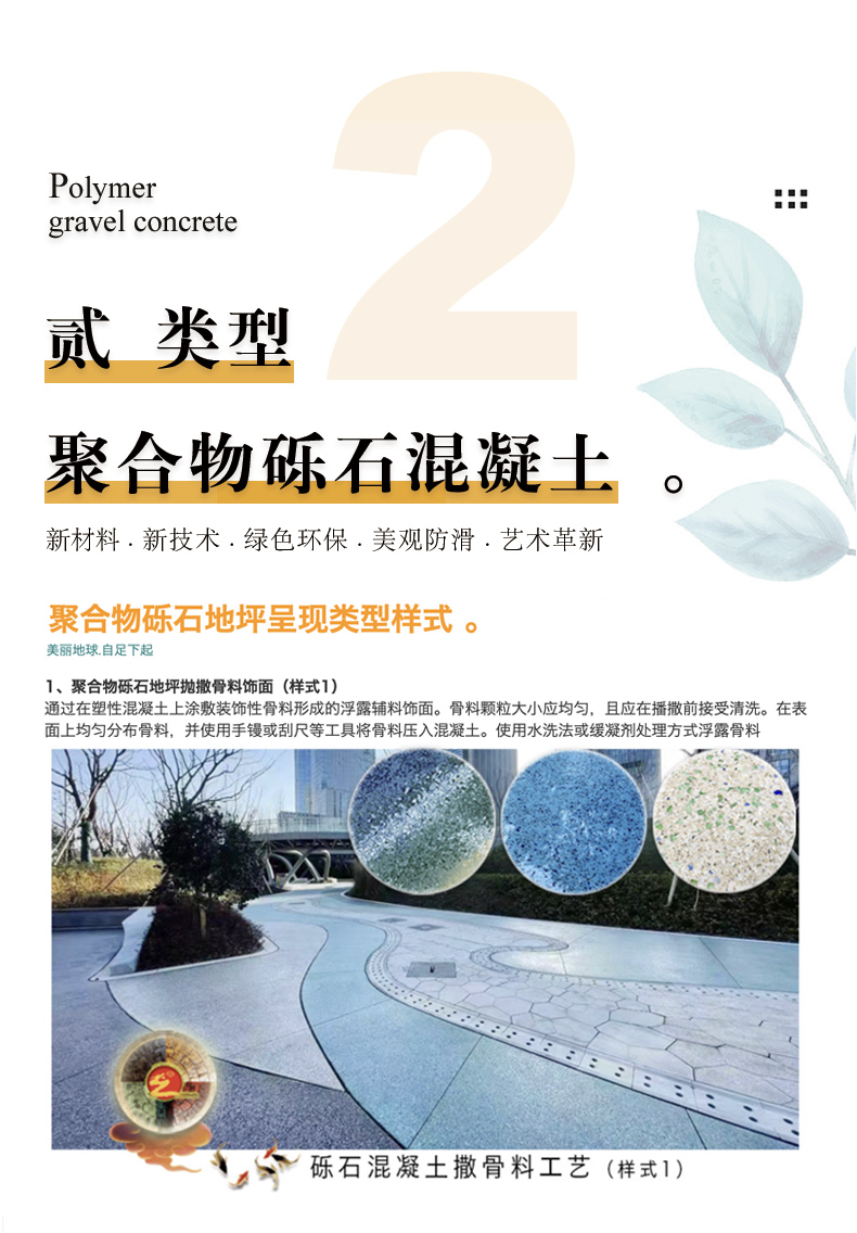 砾石聚合物混凝土是目前国际上更新的高科技环保铺装系统。是由通体色彩混凝土结合天然砾石、点缀玻璃、矿物闪光骨料级配色彩石形成的聚合物改性高强装饰性混凝土,高强抗裂、自然美观、经久耐用。