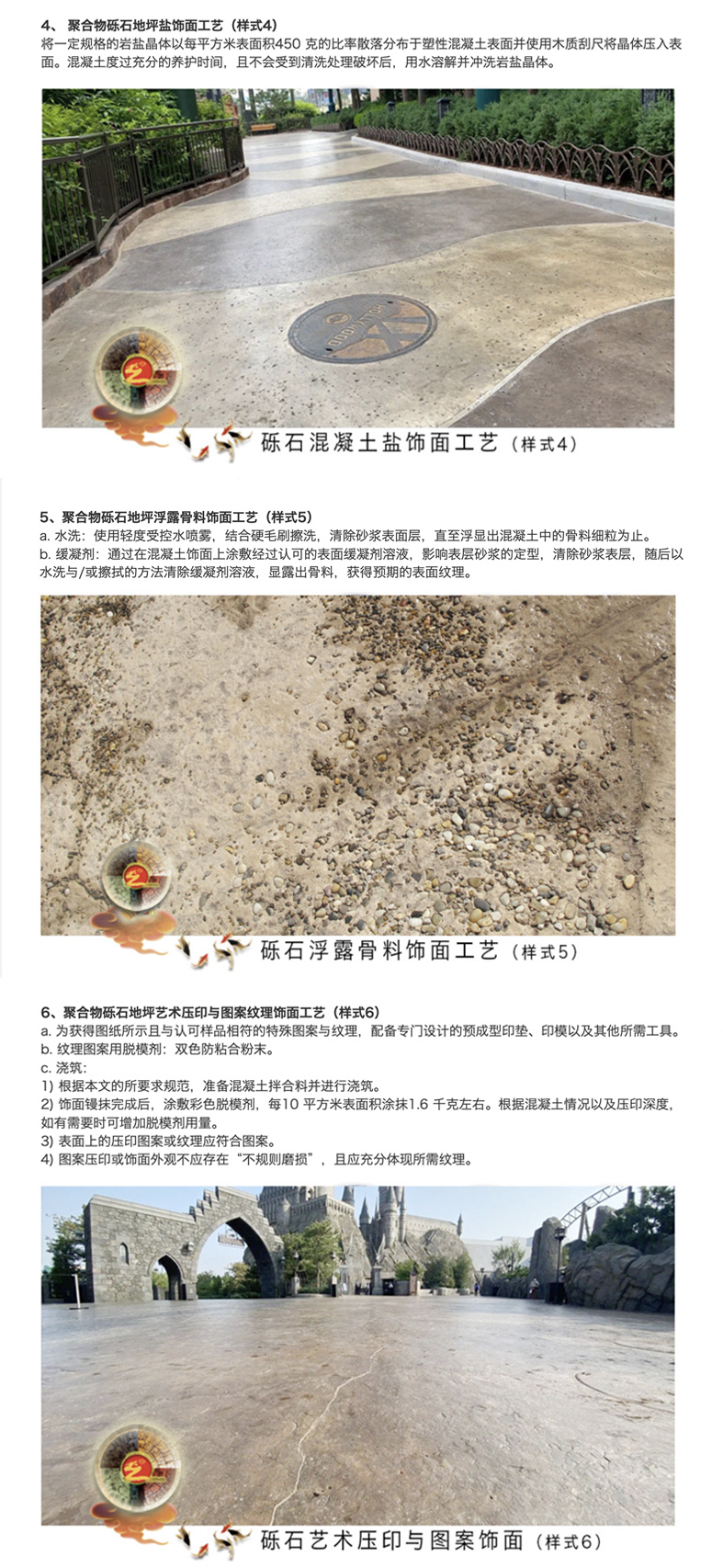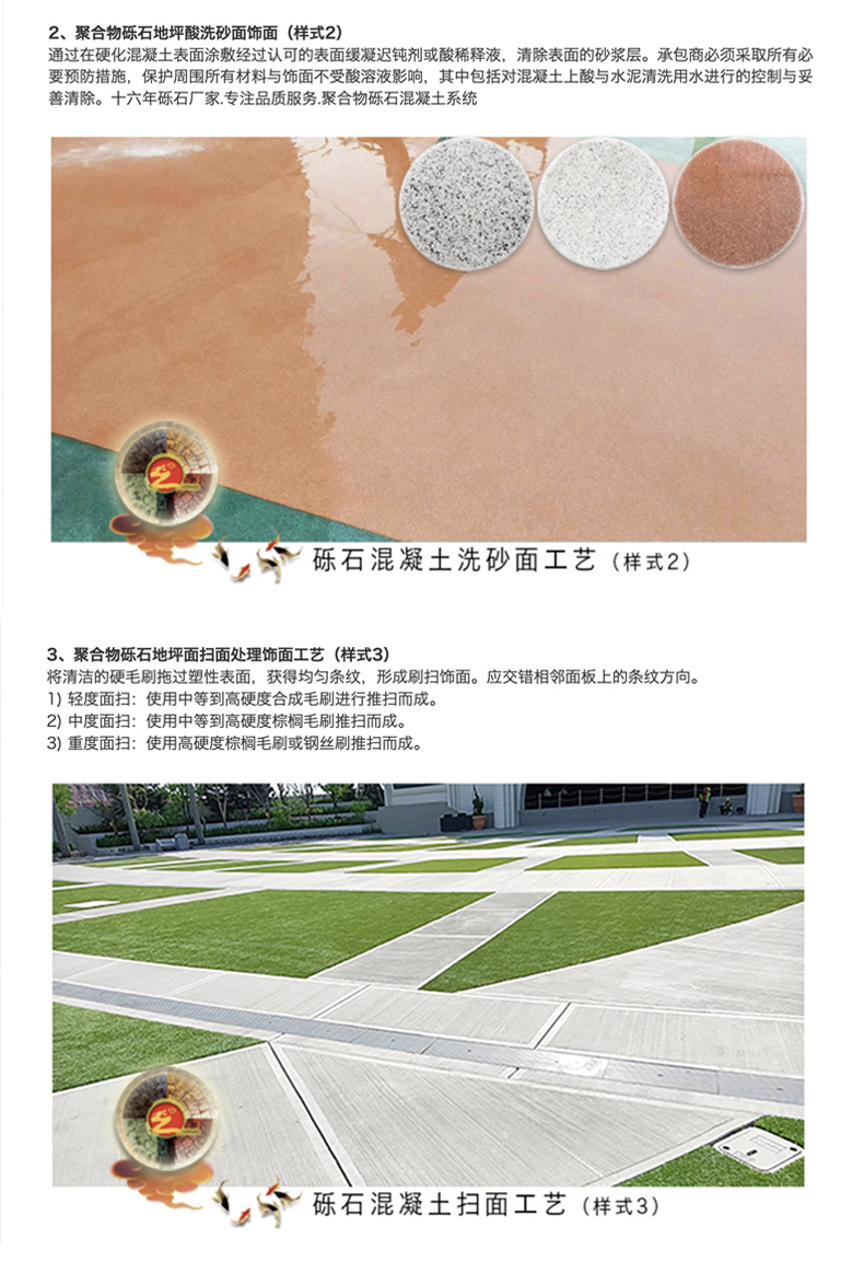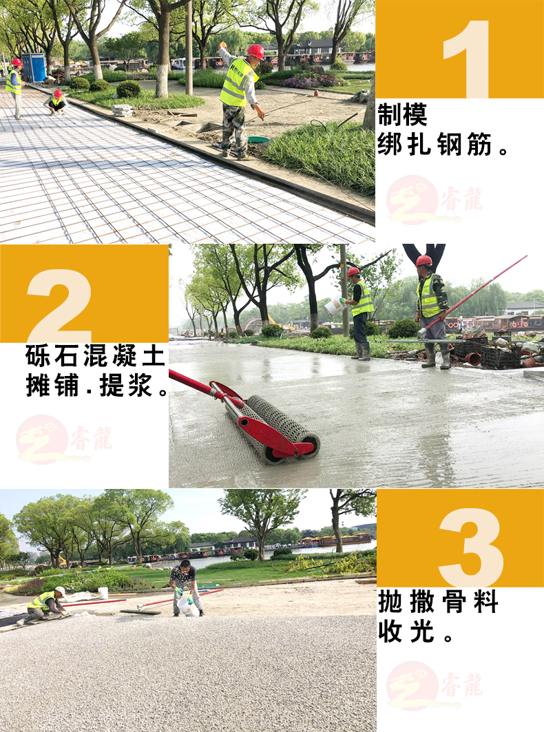 聚合物混凝土摊铺在工作面,用专用工具提浆刮平粗平混凝土,凝土表面抛洒设计效果的各色骨料,通过专业工具将骨料镶嵌在混凝土中,为保证大面积施工的稳定,利用化学缓凝钝化剂的方式控制骨料表面浆料与基础混凝土的强度时间,用水冲洗掉骨料表面的浆料,以达到或多或少或深或浅的裸露骨料均匀一致的暴露效果。