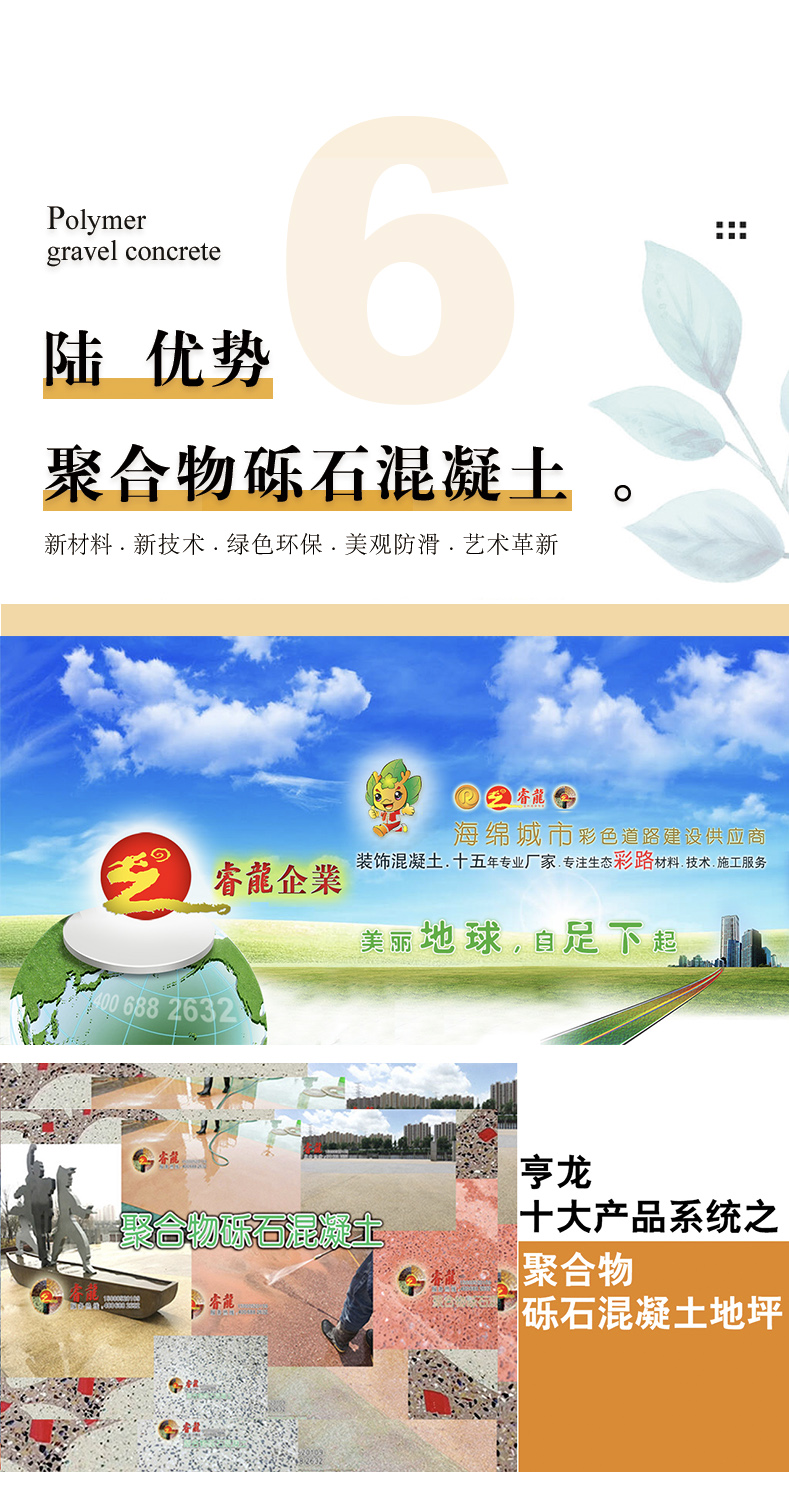上海亨龙环保是从事经营新型绿色生态路面和彩色装饰混凝土铺系统的新型行业。立足上海,服务全国,集科研、开发、生产、设计、销售、施工及概念服务于一体,一站式服务。品牌商标“睿龙”“亨龙”,拥有“海绵城市透水道路”、“聚事物砾石混凝土”多项专利。美丽地球.自足下起,坚持以“创新、绿色、质量、共赢”理念持续发展,多中心城市设生产车间,旨在为彩色艺术生态彩路和装饰混凝土领域提供品种齐全的优质环保产品和服务。
