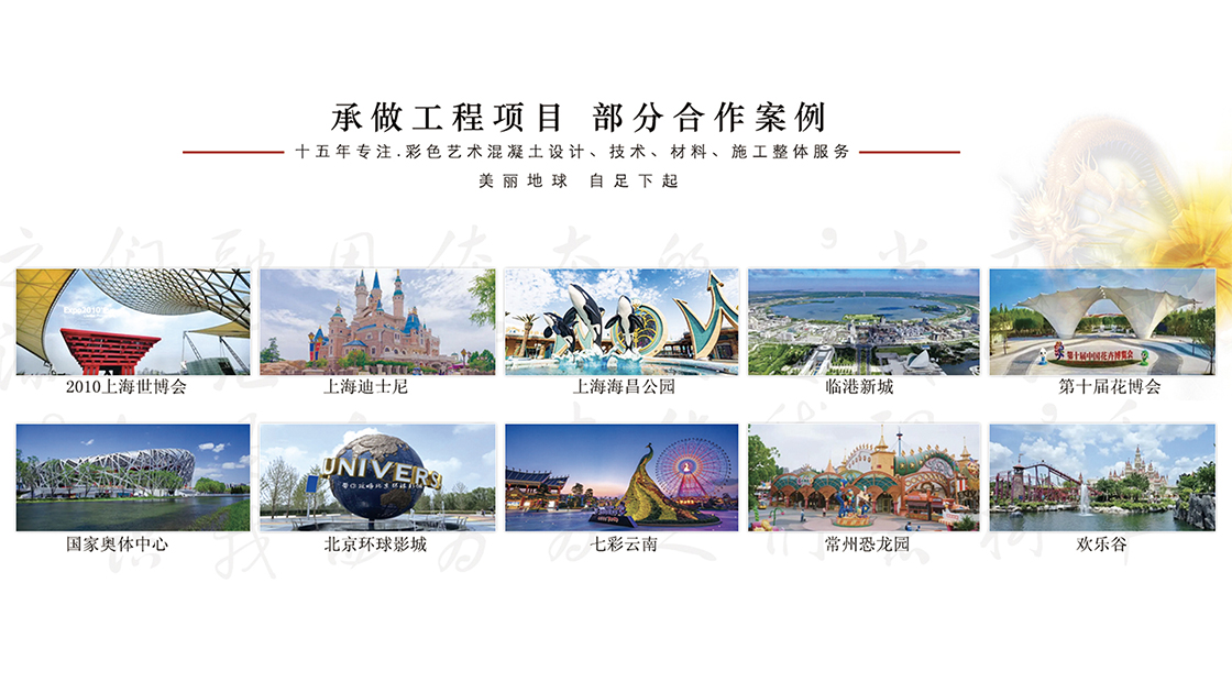 十五年专业环保生态彩路从业经验和队伍,十余种产品系统, 百余款产品材料、技术、施工概念服务的引领者。完善的售前售后服务及施工指导体系,同时可代为客户进行各类装饰混凝土的设计和施工的技术指导。
