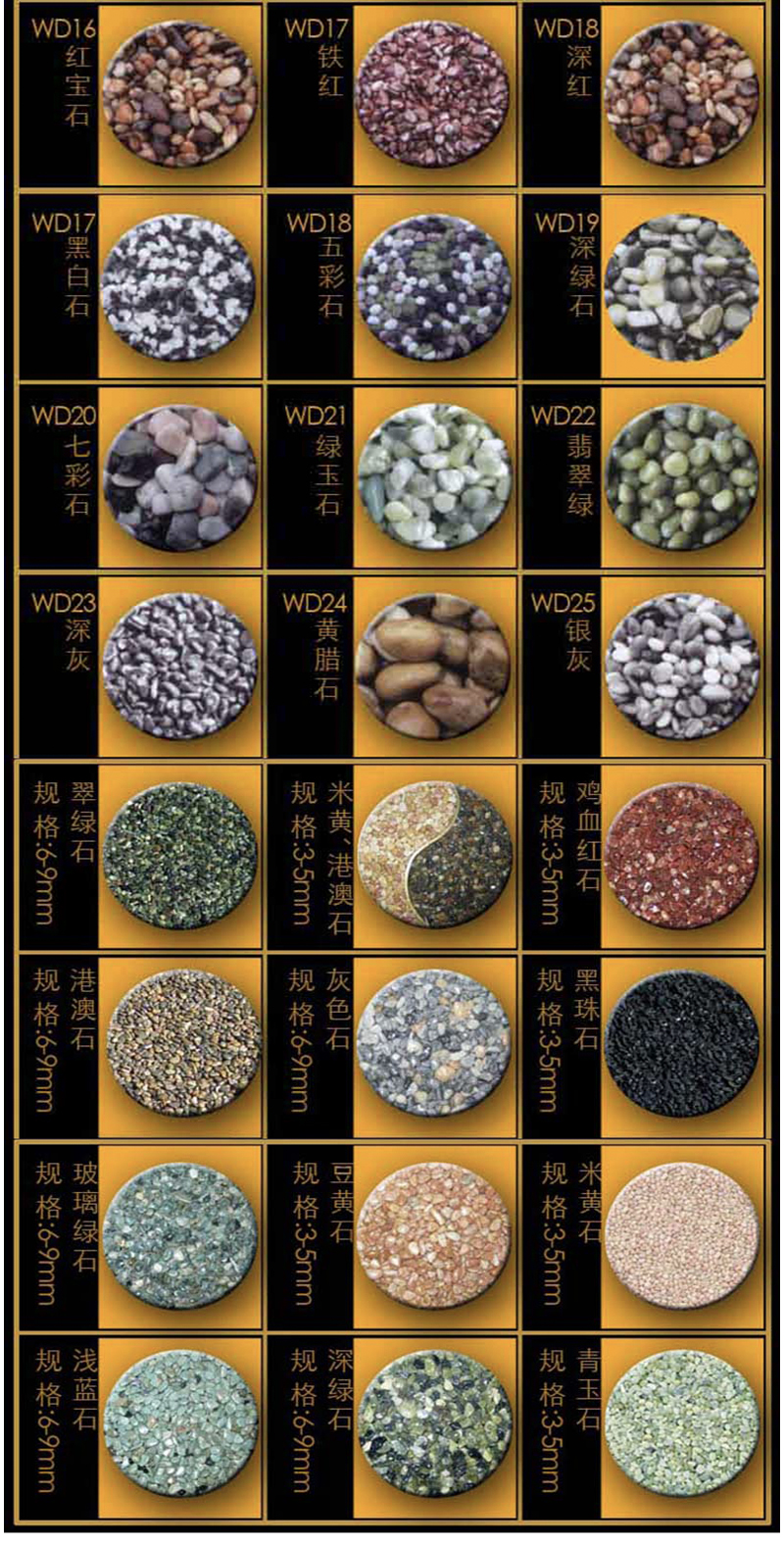 材料用量:胶粘石胶每平方米1千克,彩色石子每平方米35千克