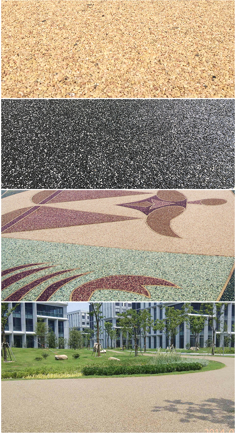 生态胶粘石透水地坪是采用改性性树脂胶和天然彩石搅拌均匀,铺装在混凝土或沥青路上的一种透气、透水、豪华型生态路面。原材料环保,色彩自然、典雅大方,环保经济,是新一代石材替代品。厚度一般为2cm,亦可指定任意厚度。将黄金砂,五彩珍珠,黑珍珠、白玉石、咖啡红,米黄玉,粉红玉,海洋绿等各种名贵天然石来制作而成的一种带有空隙,具有透水、透气、防滑、按摩等功能的特殊铺装系列,粒粒天然石米清晰可见,色彩璀璨绚烂。