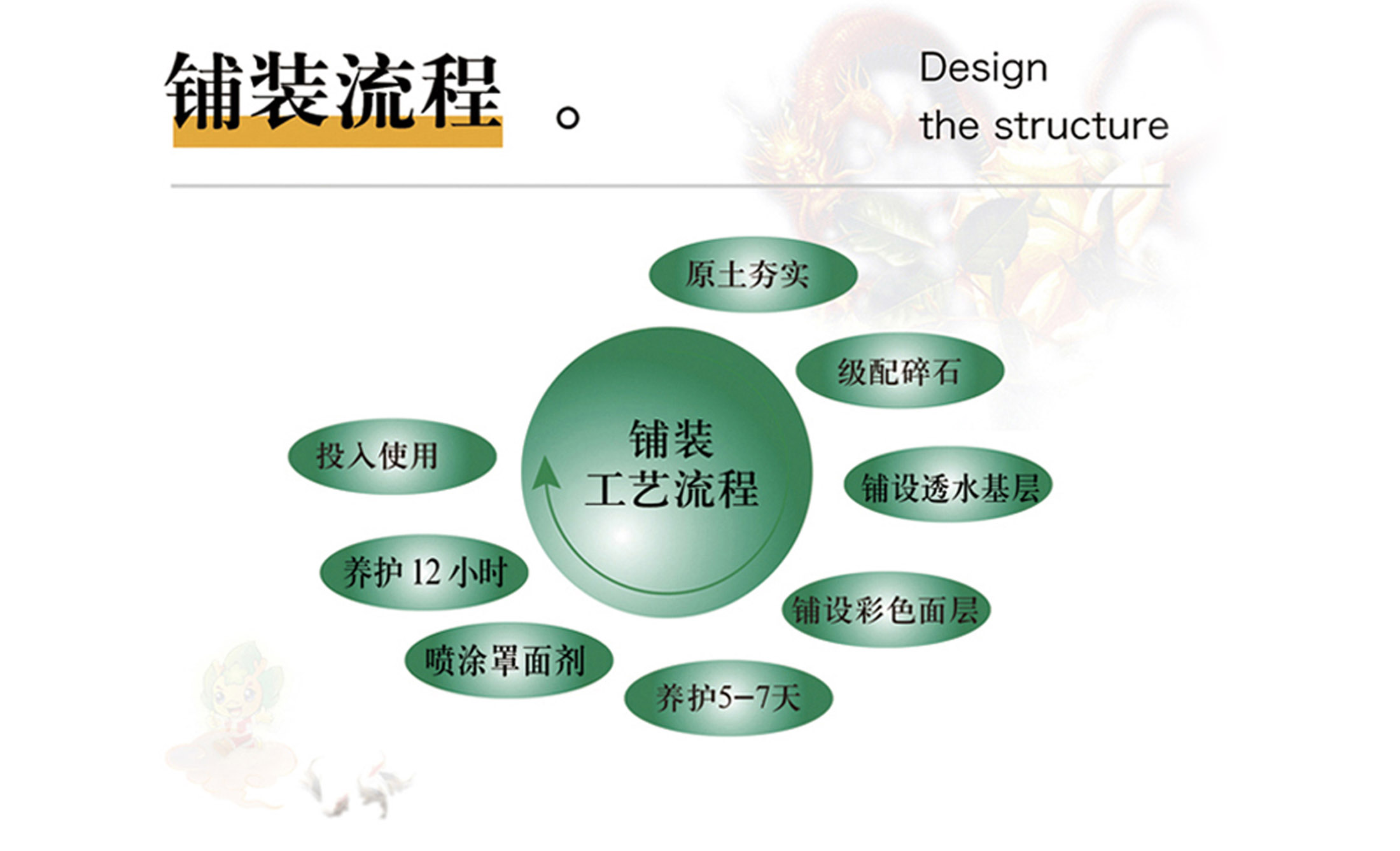 十五年专业环保生态路面厂商,九大产品系统, 百余款产品材料、技术、施工概念服务。完善的售前售后服务及施工指导体系,同时可代为客户进行各类彩色混凝土装饰面层的设计和施工的技术指导。
